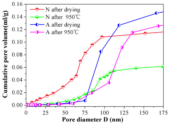 Relationship between cumulative pore volume and pore diameter for samples A and N before and after 950 °C heat treatment.