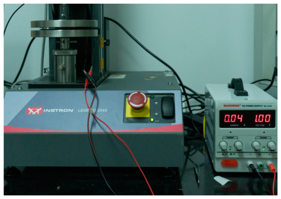 The interfacial conductivity of the sample was characterized by the contact resistance, and the ICR was measured using Wang’s method [45]. The sample was sandwiched between two pieces of carbon paper (a simulated gas diffusion layer using TGP-H-060 carbon paper with a thickness of 0.2 mm) produced by the Toray Corporation of Japan. The outer layer was supported by a copper plate, which was uniformly pressed during the test to apply pressure to the sample. An Instron LEGEND2345 universal testing machine (Boston, MA, USA) was used to control the pressure change. An external circuit provided a constant voltage of 1 V, and the current produced from the circuit under different pressures was measured by a precision multimeter. Finally, the overall resistance value was calculated by voltammetry. An image of the testing device is shown in Figure 2.
