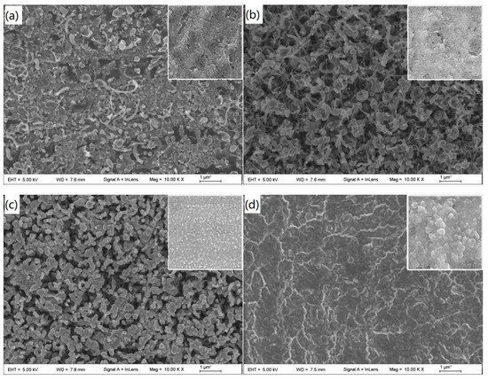 Figure 3 shows SEM images of the morphology of the CNTs before and after CNT growth for different etching times. Sample A was not subjected to plasma treatment, and the HF-etched stainless steel surface was divided into large islands and particles of different sizes. The carbon source gas grew sporadic CNTs using the stainless steel particles as a catalyst. The diameter of the CNTs was up to 100 nm and the smallest was 10 nm (Figure 3a). After sample B was plasma treated for 5 min, the surface grain boundaries became more obvious, and the carbon source gas grew a large number of CNTs using these nanosized particles as a catalyst (Figure 3b). However, due to the insufficient density of the nanosized particles, there was a lack of sufficient van der Waals forces between the growing CNTs, which caused them to become entangled (Figure 4a). As the plasma treatment time increased to 10 min, the stainless steel surface particles became more rounded, their size more uniform and their density larger (Figure 3c). It can be seen from Figure 4b that the growth direction of the CNTs could only be perpendicular to the surface of the stainless steel, and the diameters of the CNTs were 30–60 nm. When the plasma treatment time was 20 min, the small particles on the stainless steel surface combined and became larger and more rounded stainless steel particles due to the influence of the high temperature and the plasma. Large-particle stainless steel dissolved a large amount of carbon during the growth of the CNTs. When the temperature was lowered, some carbon precipitated from the surface of the stainless steel to form amorphous carbon instead of CNTs (Figure 3d).
