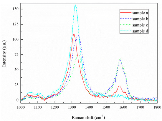 The Raman spectrum of the CNT film on the surface of the sample is shown in Figure 5. The results show that sample had only one peak at , while samples A, B and C had peaks at and , which corresponded to the two main peaks for multiwalled CNTs. As shown in Figure 3, the SEM photographs show that stainless steel sample D had no CNTs on its surface, while samples A, B and C had CNTs on their surfaces. Moreover, samples A, B and C had values for of 4.5, 1.6 and 1, respectively, and the relative intensities of the D and G peaks () indicated the degree of CNT disorder and the density of defects. Therefore, among the four sets of samples, sample C had the best degree of graphitization and the lowest degree of defects. However, the value of sample C was still large, indicating that the CNTs grown on the surface had certain defects. The results indicate that the catalytic effects were influenced by the type and distribution of the catalysts, and that the purity of the grown CNTs decreased with the increase of nonuniformity in the catalysts.