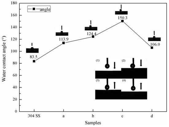 The static contact angle measurement results for the water droplets on the surface of the sample are shown in Figure 6. The plasma treatment changed the size and density of the stainless steel particles on the surface of the sample. The density of the stainless steel particles determined the growth density of the CNTs because there were catalytic elements in the stainless steel particles. The surfaces of the modified samples formed various micro-nanostructures with gaps that could capture air to lift the droplets for better hydrophobicity. Therefore, the contact angle of the modified sample was greatly improved when compared with the bare 304 SS contact angle (83.5°). Moreover, the contact angle of the sample surface increased as the density of the CNTs increased. The stainless steel particle density on the surface of sample C was the largest of all the samples, and consequently, sample C had the largest CNT density and surface contact angle. The measurement of the contact angle of sample C was 150° (Figure 6). The dynamic process of the water droplets in contact with the surface of sample C showed that the water droplets did not adsorb to the surface of the sample when they came into contact, and that even if the water droplets that came into contact with the surface of the sample were squeezed, they could still be separated from the surface of the sample. This indicates that sample C had superhydrophobic properties and low adhesion. When the large-particle stainless steel on the surface of sample D was used as a catalyst, the products deposited were mainly amorphous carbon. Compared with CNTs, amorphous carbon had a surface contact angle that rapidly decreased to 106° due to the lack of a surface microstructure.