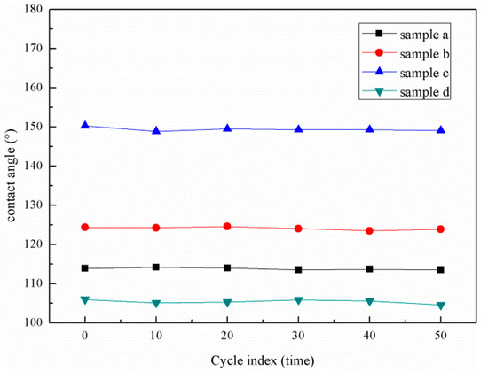 Since stainless steel bipolar plates undergo a transition from a low-temperature environment (−10 °C) to a normal operating temperature (80 °C) during a cold-start, the hydrophobicity of the stainless steel bipolar plate cannot change substantially when alternating between high and low temperatures. Therefore, the hydrophobicity of the sample also required high and low temperature resistance tests. The tests used a high and low temperature damp heat test chamber (model: EW0470) to simulate high to low temperature environments. The sample was placed in a high to low temperature damp heat test chamber, and the temperature change was set from −10 to 80 °C over 5 min to simulate the fuel cell cold-start process. The temperature was raised from −10 to 80 °C and then returned to −10 °C. This process was recorded as one cycle. The entire experiment was cycled 50 times. The contact angle was measured and recorded every 10 cycles.