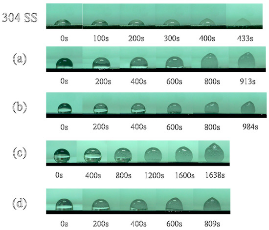 Figure 8 shows the experimental results for the “in situ icing” test. The water droplets were hemispherical on the stainless steel surface, with the largest contact area corresponding to the shortest icing time (443 s) over all the samples. The icing time (931 s) of the water droplet on the surface of sample A was twice that of the bare stainless steel surface, and the water droplets formed a bulge at the top after completely freezing. The icing time (984 s) of the surface water droplets on sample B was larger than sample A, and the shape change of the water droplets during the icing process was not substantially different from that of sample A. The contact area between the surface of sample C and the water droplets was the smallest of all the samples, and a stable spherical shape was formed. The shape of the water droplets changed during the icing process and formed a peach shape after 1638 s, after which the water droplets became completely opaque ice. The water droplet freezing time (809 s) on the surface of sample D was longer than the freezing time on the surface of the bare stainless steel but was shorter than those of samples A, B and C. These data show that the better the hydrophobic properties of the surface of the sample are, the smaller the contact area is, and the longer the freezing time for the water droplets on the surface of the sample is. From a theoretical analysis of infiltration, we can see that there was a large amount of air between the microstructures of the superhydrophobic surface. This formed a natural barrier that reduced heat loss and made the bottom of the water droplets less likely to freeze. Over time, the low temperature caused the top of the spherical water droplets to begin to freeze and form a bulge. The ice crystals gradually grew downward until they were completely frozen, but the water droplets never spread out on the surface of the sample. Although the superhydrophobic surface did not completely prevent the water droplets from freezing, it could prolong the freezing time of the water droplets on the surface of the sample.