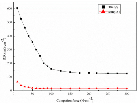 Figure 9 shows the contact resistance of sample C and the bare 304 SS as a function of pressure. As the interface pressure increased, the contact resistance of sample C and the bare 304 SS significantly reduced. Since the interface pressure was small, there was a small contact point between the sample and the carbon paper, resulting in a large contact resistance. Since the contact between the sample and the carbon paper was a point contact when the interface pressure was small, the contact resistance was large. The carbon paper was deformed as the interface pressure increased, and the contact area between the sample and the carbon paper gradually increased, meaning that the interface contact resistance gradually reduced. When the interface pressure increased further, the deformation of the carbon paper reached a limit, and the contact area did not change further, meaning that the contact resistance also remained stable. When the pressure of sample D was greater than , the contact resistance was basically stable. Nevertheless, when the pressure of the bare 304 SS was greater than , the contact resistance remained stable. The reason for this phenomenon is that the growth of the CNTs on the surface of sample C only required a small amount of pressure for complete adherence to the carbon paper, whereas the pressure required for the bare 304 SS to adhere to the carbon paper was large. As seen in Figure 9, the contact resistance of the bare 304 SS was always greater than that of sample C. The main reason for this is that the conductivity of the oxide film on the surface of the bare 304 SS was worse than that of the CNT film. The assembly pressure of the PEMFC stack was , and the contact resistance should be less than [46]. Under this pressure, the contact resistance of the bare 304 SS was . The contact resistance of sample C was , which is only 10% of the bare 304 SS’s contact resistance. Therefore, the growth of vertical CNTs on the surface of the stainless steel could effectively reduce the contact resistance and meet the requirements of a bipolar plate in terms of conductivity.