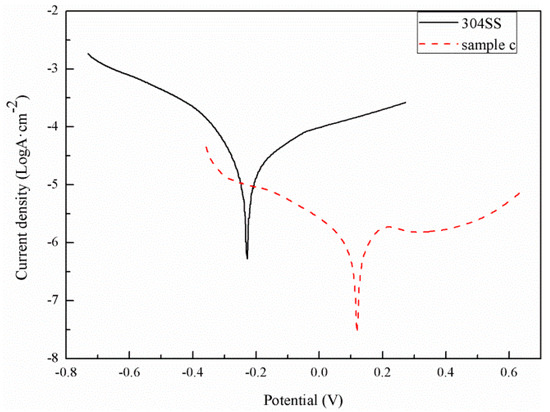Figure 10 shows the potentiodynamic polarization curves of sample C and the bare 304 SS in a simulated PEMFC environment. The corrosion potential of sample D was 0.12 V, which was 0.35 V higher than that of the bare 304 SS. The corrosion current density of the bare 304 SS was , and that of sample C was . The corrosion current density of sample C was one order of magnitude lower than that of the bare 304 SS. This is mainly because the vertical CNTs on the surface of sample C could effectively isolate the stainless steel substrate and etching solution. The more positive the corrosion potential is, the smaller the corrosion current is, and the more corrosion-resistant the material is [47,48]. Therefore, sample C showed better corrosion resistance than the bare 304 SS.