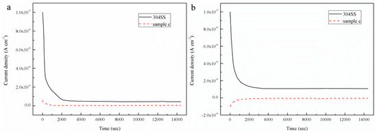 Potentiostatic polarization curves for sample C and the 304 stainless steel in a simulated PEMFC: (a) 0.6-V cathodic environment and (b) −0.1-V anodic environment.