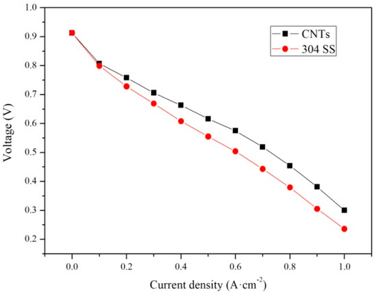 The initial performances of the cells with bipolar plates, with or without the application of vertical CNTs, are shown in Figure 12. The open circuit voltages of the two fuel cells were both at 0.913V. The output voltage of bare 304 SS attenuated faster than that of the 304 SS with vertical CNTs. The different voltages between them mainly occurred in the ohmic and concentration polarization regions. The voltage difference in the ohmic polarization region was caused by contact resistance, as shown in Figure 9. The metal ions from the bare 304 SS contaminated the proton exchange membrane, which weakened the chemical reaction and led to voltage loss in the concentration polarization region.