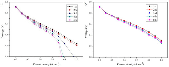 Figure 13 shows the performance of two cells during five cold-start cycles. No performance loss was observed when the current density was less than 200 mA·cm−2, and the voltage loss of bare 304 SS increased with the number of cold-start cycles, as shown in Figure 13a. After the third time, the cell could not start. The reason for this is that the metal ions ionized from bare 304 SS as they were polluted by the proton exchange membrane, resulting in a weakened cell reaction. Further, ice formed by water in the flow channel prevented the gas from entering the reaction region, which led to the sharp attenuation in the concentration polarization region. Figure 13b shows that the maximum voltage loss of the cell with the vertical CNT 304 SS bipolar plate was about 0.04V during five cold-starts. Due to the superhydrophobic property of vertical CNTs, the cell could reduce the formation of ice and quickly remove water at low temperatures. Moreover, the vertical CNTs had good corrosion resistance, which ensured that cell performance would not be irreversibly attenuated with the number of experiments.