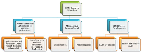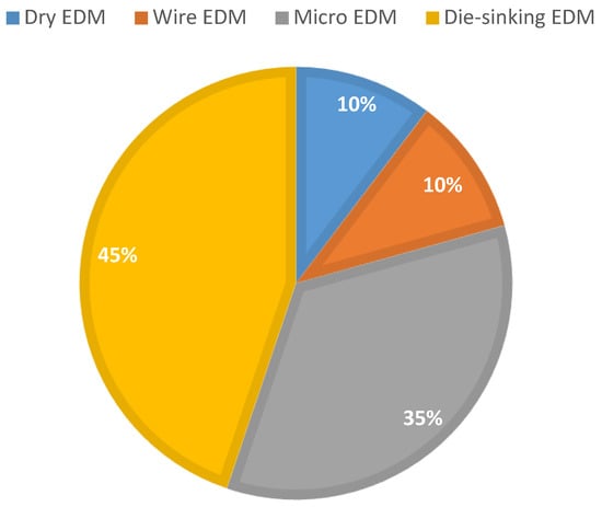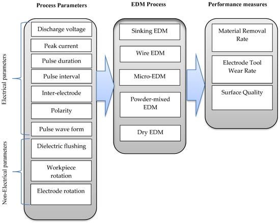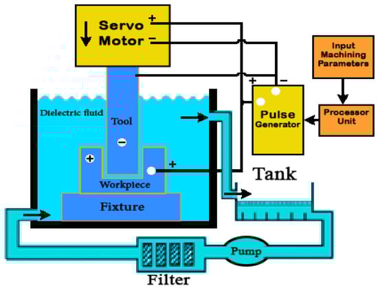 Electric discharge machining (EDM) is one of the most advanced and successful manufacturing methods used to machine materials that are difficult-to-cut [8,9,10,11,12]. EDM is being used in modern industries to facilitate complex machining processes and achieve highly accurate machining [13,14,15,16,17,18,19,20]. EDM is utilized to remove material from a conductive workpiece by repetitively applying sparks between the EDM electrode tool or wire and the workpiece. In this process, no mechanical cutting forces are applied because no contact exists between the electrode tool and the workpiece [17,21,22,23,24]. The fundamental principles of the EDM process are applied in many processes, including: die-sinking EDM, wire EDM, micro-EDM, powder-mixed EDM and dry EDM. These variants make the process suitable for machining components from the relatively large to the micro-scale.