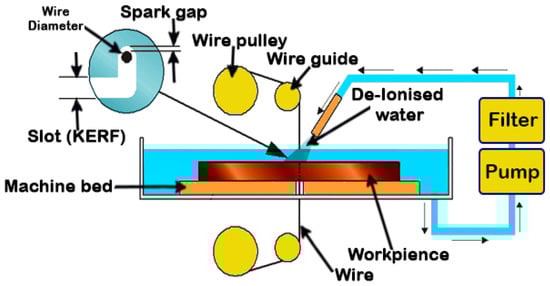 In the wire EDM, a metallic thin wire is used to cut the workpiece along a well-defined path. Discrete sparks between the wire and the workpiece cause eroding in the machined area. The wire used is usually thin, the standard EDM wire is 0.25 mm. Micro-wires dimeter can range from 0.020 mm to 0.15 mm [107] and is normally copper, brass or coated steel materials. As with the die-sinking EDM, the wire and the workpiece do not have any contact during machining [108] and both should be immersed in a dielectric fluid. A high peak current of short duration is applied in this process. The machining variables and the movement of the worktable that holds the workpiece are controlled by the control units. Thus, complicated shapes can be produced using this process [9,14,27,109,110,111,112,113,114]. The control unit contains a microprocessor to maintain the gap between the wire and the workpiece in a suitable range, normally between 25 µm and 50 µm. In addition, the unit controls the feeding of the wire through the workpiece at a suitable speed that produces surfaces with very high accuracy. De-ionized water is a common dielectric fluid used in this process. The wire EDM process has a wide range of applications, such as in die making, electronics and automotive industries [115,116]. Closed operations, which do not start from the edges of the workpiece, require the drilling of a full-depth hole to start the machining process. Figure 4 shows a schematic diagram of the wire EDM.