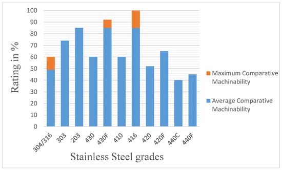 The machinability, which is defined as the speed at which a material can be cut [154], is different for the different stainless steel grades. The 400 series is most easily machined, whereas the 200 and 300 series are the most difficult [155]. Figure 5 presents the comparative machinability of the most frequently used stainless steel.