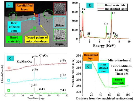 (a) Scanning Capacitance Microscopy (SCM) photograph of the cross-section of the AISI304 in high-speed dry EDM; (b) EDS spectra of the re-solidified layer and base materials; (c) XRD diffractograms of the re-solidified layer, heat affected zone and base materials; and (d) micro-hardness of the cross-section [48].