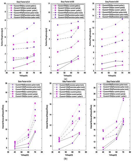 Ugrasen, et al. [193] used multiple regression analysis and the group method data handling technique to develop a model for predicting the parameters that defined machine performance. The effects of the cutting parameters, including pulse-on, pulse-off, current and bed speed with constant voltage and flush rate on the four response parameters (accuracy, SR, volumetric MRR and TWR), were discussed. Muthuramalingam and Mohan [188] studied the surface finish obtained using an iso duration current pulse generator. The authors reported that, the modified iso duration current pulse generator produced a better SQ with a higher MRR than the conventional transistor pulse train generator. Figure 7 shows the effect of pulse generators on the material removal rate and on SR.