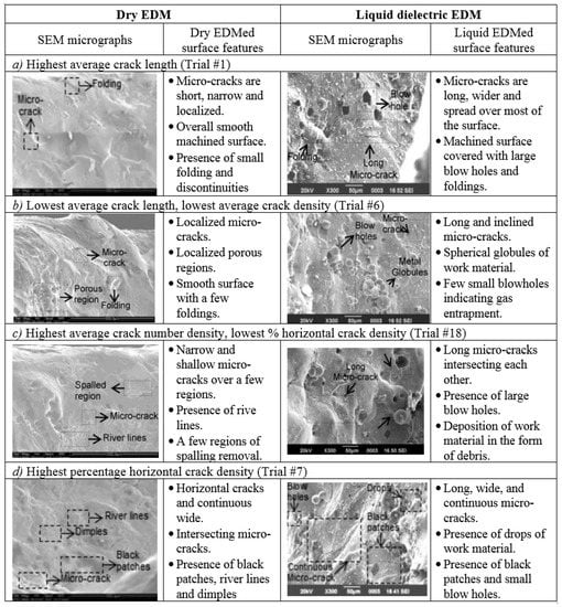 - Govindan, P.; Joshi, S.S. Analysis of micro-cracks on machined surfaces in dry electrical discharge machining. JMP J. Manuf. Process. 2012, 14, 277–288. [Google Scholar] [CrossRef]