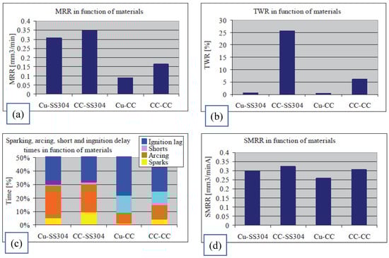 (a) MRR dependence on anode and cathode material combinations; (b) TWR as a function of anode and cathode material combinations; (c) sparking, arcing, shorts and ignition delay times as a function of anode and cathode material combinations; and (d) current specific MRR as a function of the anode and cathode material combinations [176].