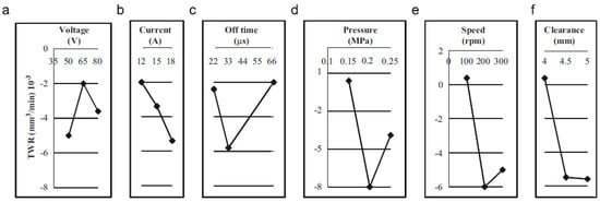 (a–f) Main effects of input parameters associated with the tool wear rate (TWR) [174].
