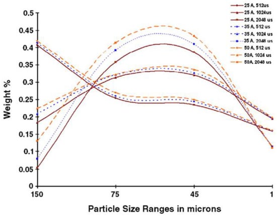 Figure 14 shows the particle size distribution with varying current intensities and pulse widths when deionized water was the medium.