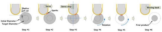 Figure 17 shows the sequential steps of EDM with the strip electrode. Song, et al. reported that an advantage of strip-EDM, was that it increased the MRR because it has a larger machining area than a wire or non-breaking electrode. The study reported many experiments to determine the machining characteristics of strip-EDM using stainless steel 304 and complex shapes. Figure 18 shows the machined product using three kinds of strip-EDM turning.