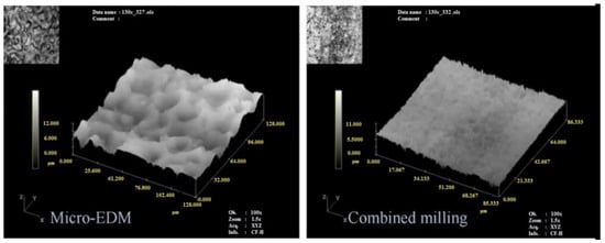 The micro-EDM is a machining process that follows the same principles as the die-sinking EDM and wire EDM. The process removes material at the micro-scale for components smaller than 100 μm, including micro-holes, micro-shafts and 3D micro-cavities [117]. The only principled difference from the other EDM processes is the power involved [51,118,119,120]. The MRR will be in nanometres because the machine part is at the micro level and the required voltage and current will be several times less than those used in the die-sinking EDM or any other normal-level EDM process. This process can produce a hole or shaft diameters of only 5 µm, while holes of up to 70 µm and 40 µm can be produced by drilling and laser machining, respectively [121]. EDM at the micro-scale level is available in many machining processes, such as die-sinking micro-EDM [122], micro-wire EDM [123,124], micro-EDM drilling [125,126,127,128] and micro-EDM milling [129]. In the micro-wire EDM, a wire with a diameter less than 20 μm is used. The minimum machinability of cavities in other micro-EDM processes have diameters of 5 µm. The grain sizes of workpiece materials have significant impact on the characteristics of micro EDM [130]. The MRR for micro-EDM has a direct relationship with the grain size of the machined workpiece because the effective thermal conductivity and local effective melting point of polycrystalline materials vary with grain sizes of these materials since the grain boundary volume fractions change [131]. It is worth emphasizing that the material microstructure of the processed workpiece plays a significant role in the performance of the micro EDM process. In particular, the refined material microstructure can give a better surface quality when compared with the results for the course grained microstructure of the same material. This conclusion is explained by the heterogeneity of the course grained material microstructure that normally leads to more anisotropic behaviour of the microstructure and the more homogenous response of the refined microstructure that results in more isotropic/consistence behaviour [132].