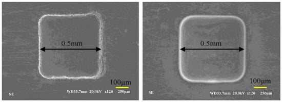 - Elkaseer, A.; Bigot, S.; Surleraux, A.; Rosochowski, A. Effect of material microstructure on the micro-EDM process. In Proceedings of the the 8th International Conference on Micro Manufacturing (ICOMM2013), Victoria, BC, Canada, 25–28 March 2013; pp. 336–343. [Google Scholar]