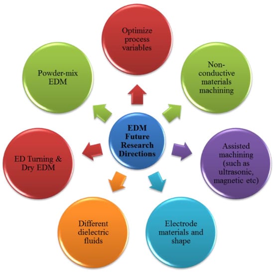 In addition to the previous main types of EDM, there are other types such as EDM milling, in this type the final shape is obtained using a simple electrode tool which is moved in a 3D path along several directions and may also subject to rotations [144]. A combination of the two cutting systems can also be applied. Also, EDM grinding, when the electrode tool design as a rotating disk [145].