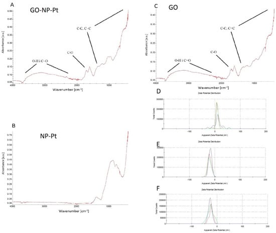 FTIR spectrum and ζ-potential of nanocomplexes of (A,D) graphene oxide and platinum nanoparticles, (B,E) platinum nanoparticles, and (C,F) graphene oxide. Abbreviations: GO-NP-Pt—nanocomplexes of graphene oxide and platinum nanoparticles, NP-Pt—platinum nanoparticles, GO—graphene oxide.