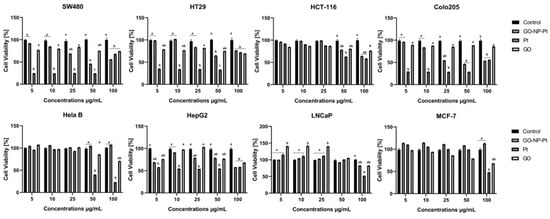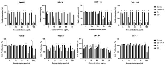 Cell viability was evaluated using a 2,3-bis-(2-methoxy-4-nitro-5-sulfophenyl)-2H-tetrazolium-5-carboxyanilide salt (XXT)-based cell viability assay kit (Life Technologies, Taastrup, Denmark). Cells MCF-7, LNCaP, Hela B, HepG2, SW480, HT29, HCT116, and Colo205 were incubated in 96-well plates (5 × 104 cells per well) with hydrocolloids of nanoparticles of GO, NP-Pt, and GO-NP-Pt at the same concentrations as for the proliferation assessment. In the subsequent step, the XTT solution was added to each well and incubated for an additional 3 h at 37 °C. The optical density (OD) of each well was recorded at 450 nm in a scanning multi-well spectrophotometer (Infinite M200, Tecan, Durham, NC, USA). Cell viability was expressed as a percentage (ODtest—ODblank)/(ODcontrol—ODblank), where “ODtest” is the optical density of cells exposed to NP-Pt, GO, and GO-NP-Pt, “ODcontrol” is the optical density of the control sample, and “ODblank” is the optical density of wells without cancer cells.