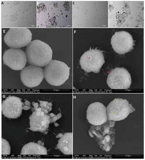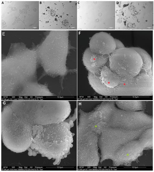 Morphology of Colo205 colorectal cancer cells. (A,E) untreated cells (control group), (B,F) cells treated with nanocomplexes of graphene oxide with platinum nanoparticles (GO-NP-Pt), (C,G) cells treated with platinum nanoparticles (NP-Pt) t, (D,H) cells treated with graphene oxide (GO). Red *—point on GO-NP-Pt at cell membrane. Green ^—point on GO at cell membrane. (A–D) Light optical microscopy. Scale bars: 50 µm. (E–H) Scanning electron microscopy. Note: Scale bars: 10 µm. Abbreviations: GO-NP-Pt—nanocomplexes of graphene oxide and platinum nanoparticles, NP-Pt—platinum nanoparticles, GO—graphene oxide.