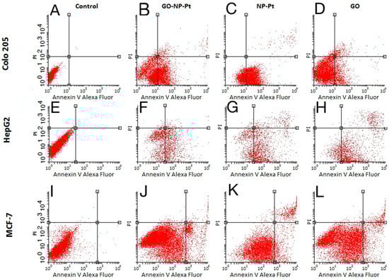 Apoptosis assay. Flow cytometry Annexin V-Alexa Fluor® 488/propidium iodide (PI) assay. Scatter diagrams of Colo205 (A–D), HepG2 (E–H), and MCF-7 (I–L) cells exposed to nanocomplexes of graphene oxide with platinum nanoparticles (B,F,J), platinum nanoparticles (C,G,K), and graphene oxide (D,H,L). Control group—non treated cells (A,E,I). Abbreviations: GO-NP-Pt—nanocomplexes of graphene oxide and platinum nanoparticles, NP-Pt—platinum nanoparticles, GO—graphene oxide.