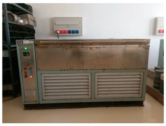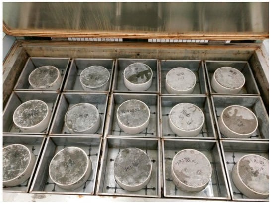 The salt-freezing equipment used DYD-1 concrete single-sided salt freezing equipment, as shown in Figure 2. The intelligent computer control system can control the limit temperature in the tank (testable range from 20 °C to −20 °C). The freeze-thaw system was operated as follows: each freeze–thaw cycle of the concrete test block was completed within 12 h, which starts from cooling down to −20 °C for 4 h and then holding for 3 h and heating to 20 °C for 4 h and then holding for 1 h. Each cycle was repeated ten times, and peeling amount of concrete is collected and weighted while replacing the new salt solution.