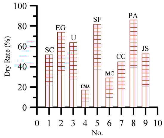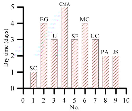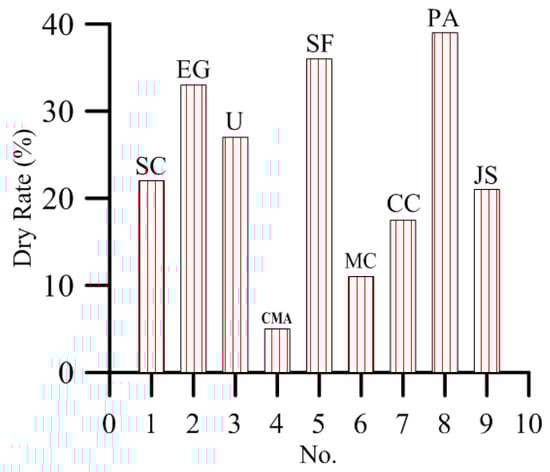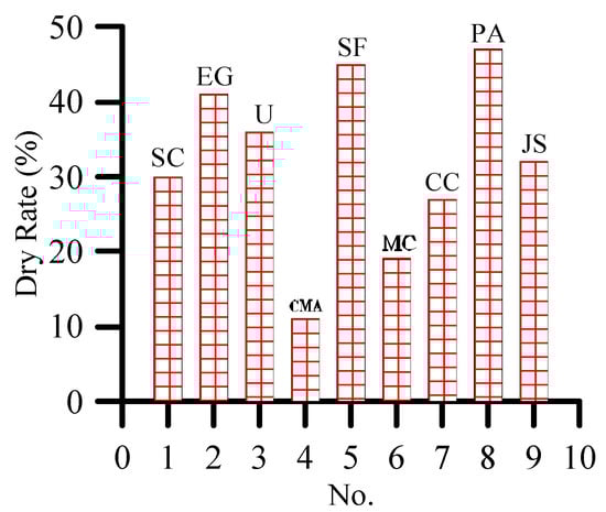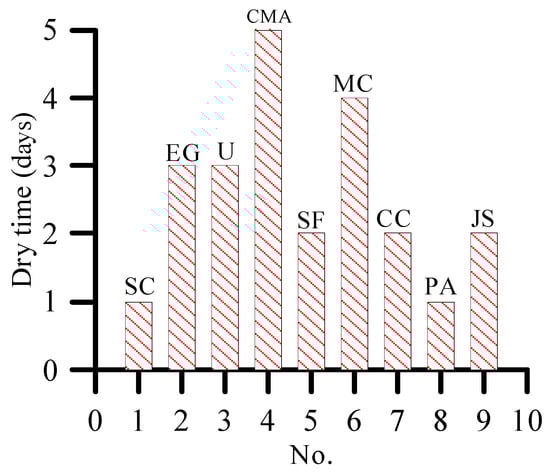 In flowerpots of same sizes (43 cm × 19 cm × 14 cm), the same grass species were planted. The selected grass species were mainly easy to operate, have a certain representativeness, and have a short test period. When the growth was prosperous and roughly the same, 25 mL of certain concentrations of No. 1 to No. 9 de-icing salts and No. 10 water was sprayed. After spraying, the growth was observed. The yellowing of the plant tip after spraying various de-icing salts was recorded, as shown in Figure 3. Dry day refers to the number of days when the tip of the plant begins to turn yellow; the dry rate refers to the proportion of plants that turn yellow.