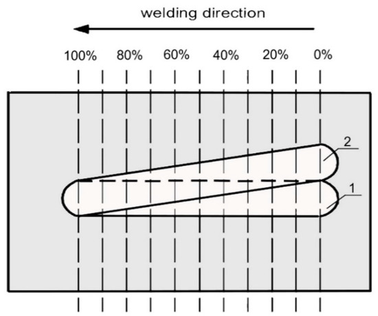 There are many weldability tests, for example the controlled thermal severity (CTS), Tekken, and implant tests [30,31,32]. For this study, the CTS test was chosen, because in a water environment the most popular welding method uses fillet welds. In addition, this test enables assessment of the susceptibility to cold cracking in all joint areas. In the next step, the TBW technique was used for pad welding to determine the influence of the pitch on the microstructure of the HAZ and the hardness of the joints. TBW specimens were made by varying the relative deposition of the beads according to methodology presented in the literature [25]. Weld beads for the TBW samples were made on 200 mm × 100 mm sections in a flat welding position. The welds were laid in order to obtain different distances between the axes of the beads (in a non-parallel manner). The welding schema with a temper bead is presented in Figure 1. This method allowed us to obtain specimens with different percentages of overlap of the second weld bead onto the first weld (pitch). Between two welds, 120 s time passed. All samples were made at a depth of 0.5 m. The diffusible hydrogen content in the deposited metal obtained by the glycerin method for wet welding with E 38 9 R 11 electrodes were in the range of 51.5 to 61.4 mL/100 g [33].