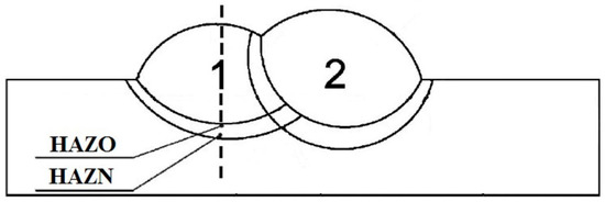 Scheme of the temper bead welding (TBW) technique specimen, 1—first (tempered) padding weld, 2—second (tempering) padding weld.