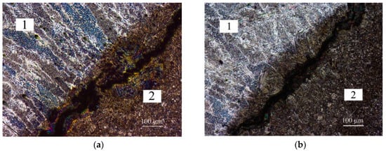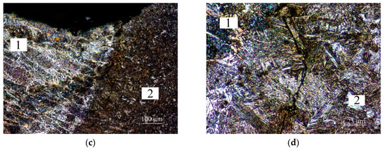 Results of CTS microscopic testing shows cracks in HAZ, 1—weld metal, 2—HAZ, (a) Specimen 1; (b) Specimen 2; (c) Specimen 3; (d) Specimen 6. Etch. Nital 4%.