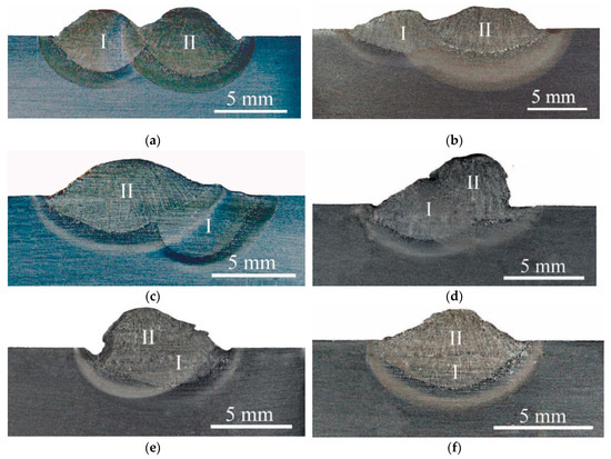 Results of the TBW macroscopic testing, I—first (tempered) bead, II—second (tempering) bead, (a) pitch 11%; (b) pitch 19%; (c) pitch 43%; (d) pitch 55%; (e) pitch 73%; (f) pitch 100%. Etch. Nital 4%.