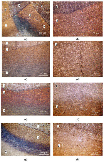 Results of TBW microscopic testing; 1—first bead, 2—HAZ under first bead, 3—area of the HAZ of the second bead overlapping the first bead, 4—HAZ of the second bead overlapping the HAZ of the first bead, 5—second bead, 6—HAZ under the second bead, 7—base metal. (a,b) pitch 11%; (c,d) pitch 43%; (e,f) pitch 55%; (g,h) pitch 73%; (i,j) pitch 100%. Etch. Nital 4%.
