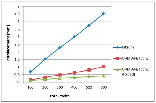 Displacement of UHMWPE fabric and human acetabular labrum from the cyclic loading test.