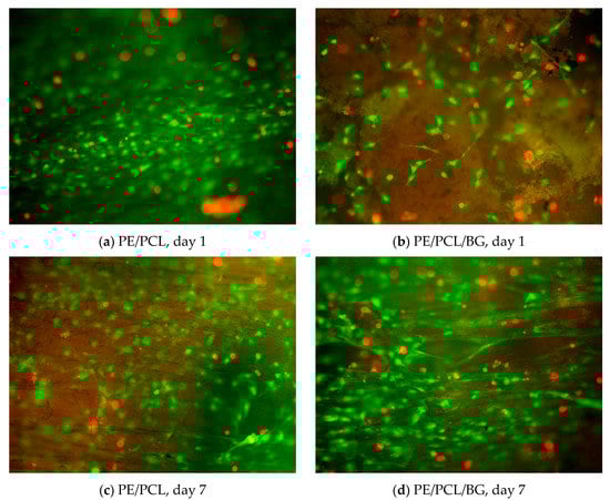 Fibroblast cells residing on PE/PCL and PE/PCL/BG composites were imaged using fluorescence microscopy, as depicted in Figure 3. These images showed live cells (green) and dead cells (red) after one and seven days of culture. Both composites were predominantly occupied by live cells, suggesting that these materials were able to provide a viable environment. At day one, fewer cells were observed on the PE/PCL/BG sample compared to the PE/PCL. Nevertheless, both groups exhibited a comparable cell occupation area and proportion of live cells after seven days of culture. Fibrous PCL was known as a favourable material capable of supporting fibroblasts growth [25,26,28,29,31,32,33,34]. On the other hand, the cytocompatibility of bioactive glass is dose-dependent [63,64]. Hence, this finding suggested that the amount of Bioglass® in the composite was suitable, as it did not induce an adverse effect on fibroblast growth.