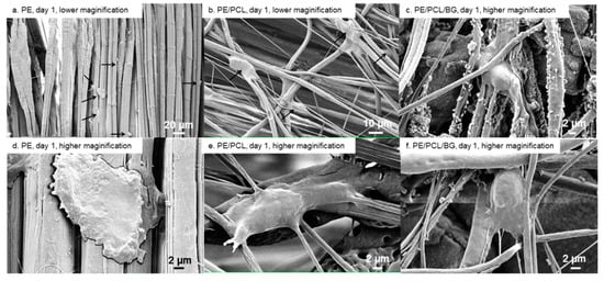 Fibroblast attachment on PE fabric (a,d), PE/PCL (b,e), and PE/PCL/BG (c,f) on day one at lower (a,b) and higher (c–f) magnification. Arrows show cells.