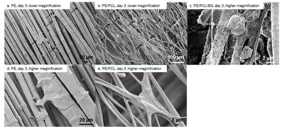 Fibroblast attachment on PE fabric (a,d), PE/PCL (b,e), and PE/PCL/BG (c) on day three at lower (a,b) and higher (c–e) magnification. Arrows show cells.