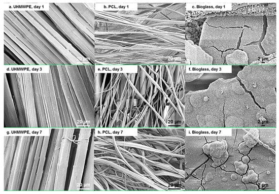 SEM images of UHMWPE fabric (a,d,g), PCL fibres (b,e,h), and Bioglass® particles (c,f,i) after immersion in cell culture medium without cells.