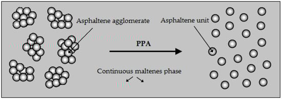 PPA breaks the asphaltene agglomerates by reacting with many of the functional groups present in the bitumen and provides a better distribution of asphaltene in the molten phase as shown in Figure 1. As a result, it contributes to the elastic behaviour of the bitumen by converting them into individual particles [39].