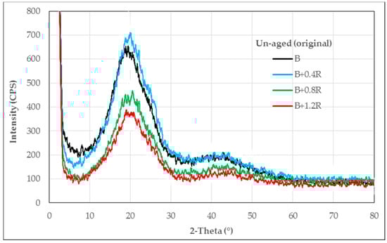 The XRD patterns obtained from neat and modified bitumens are given in Figure 3, Figure 4 and Figure 5, respectively, for un-aged (original), RTFOT-aged, and PAV-aged samples.