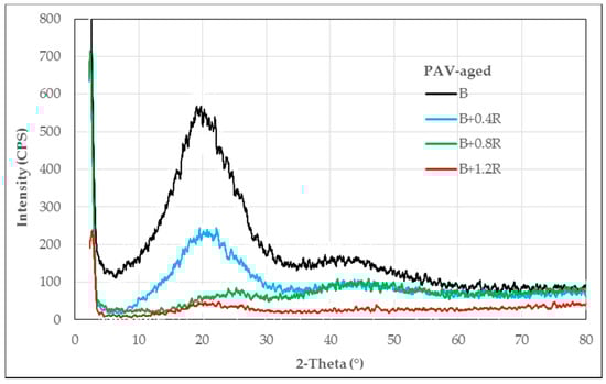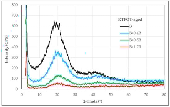 As seen in Figure 5, in PAV-aged samples, the gaps between the components in the macromolecular structure have been closed by the effect of temperature and high pressure. In the region where the 2-teta was between 7.5–32.5, the semi-crystalline region was transformed into a completely amorphous structure, while the amorphous structure at the point where the 2-teta was about 40 was enlarged and spread according to the neat bitumen. However, when the Elvaloy®RET ratio was 1.2%, the structure was transformed into a completely amorphous structure as a result of the macromolecular arrangement with the effect of pressure and temperature.