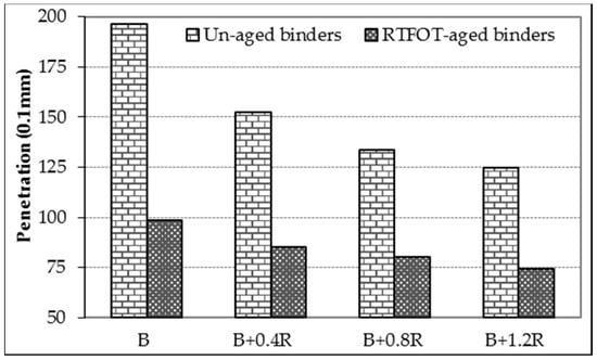 Basic physical properties of asphalt binders before and after the aging process were determined by conventional bitumen tests, and the results are shown in Table 4. The table also shows the PI values which are accepted as a measure of the temperature sensitivity of binders. In addition, the relationship between penetrations, softening points, penetration indexes of the un-aged and RTFOT-aged binders, and the additive amounts in the binder are given in Figure 7, Figure 8, and Figure 9, respectively.