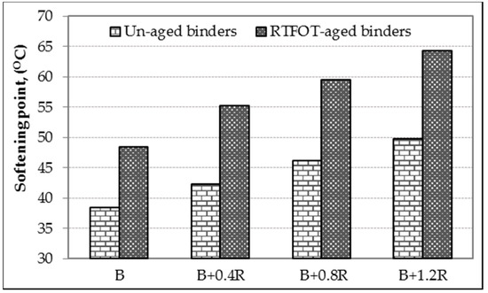 When the results of RTFOT-aged binders were examined, it was observed that their penetration values decreased but softening point values increased, as in un-aged binders. In addition, compared to un-aged bitumens, the retained penetrations of the aged binders increased by 50%, 56%, 60%, and 60%; and the softening point values increased by 10.1 °C, 12.9 °C, 13.3 °C, and 14.5 °C, respectively. These results show that the neat and modified bitumens become naturally harder and less fluid after short-term aging, and as a result they are much less sensitive to temperature, especially at high temperatures.