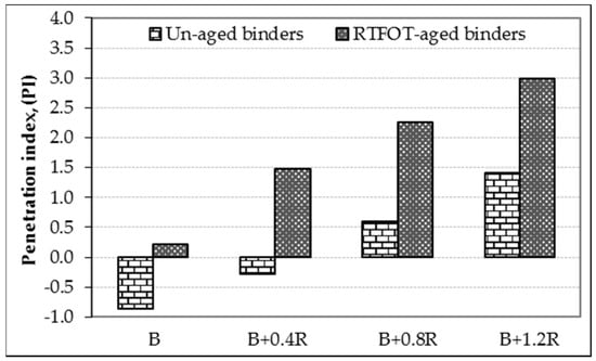 As seen in Figure 9, when the effect of Elvaloy®RET on the PI of the binders is examined, it is seen that Elvaloy®RET-modified bitumens have much higher PI values compared to neat bitumen. This rate of increase was 67.4%, 168.4%, and 264.0%, respectively, depending on the additive amount. This indicates that Elvaloy®-modified bitumens with higher PI values are more resistant to cracking at low temperatures and permanent deformation at high temperatures [29,46].