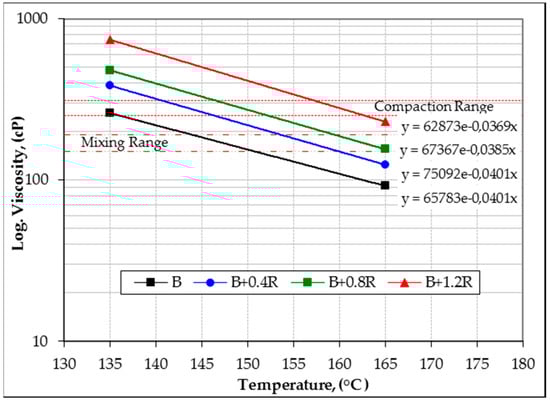 The viscosity values of bitumens at high temperatures of 135 °C and 165 °C were determined using a Brookfield viscometer (DV-III). Based on these values, the mixing and compaction temperature ranges of the bitumens for the hot mixtures were determined by means of the temperature–viscosity graph shown in Figure 10. The viscosity values (η), modification indexes (the η value of the modified bitumen was divided by the η value of the pure bitumen) and mixing-compaction temperature ranges of all binders are shown in Table 5.