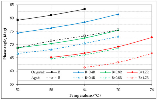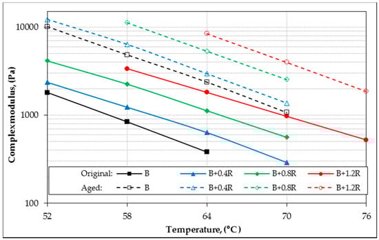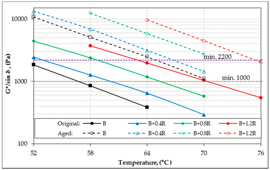 According to the Superpave specification, a minimum of 1.00 kPa for original un-aged binders and a minimum of 2.20 kPa for RTFOT-aged binders are given as limit values (both values are G*/sin δ). PAV-aged binder samples have a maximum specification of 5000 kPa for G*.sin δ. Higher G* and lower δ values in terms of permanent deformation resistance, but lower G* and higher δ values in terms of fatigue cracking resistance are desired [44,45].