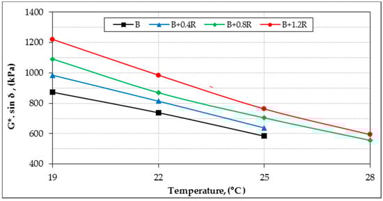 Furthermore, as seen in Figure 14, the fatigue resistance parameter values of all binders (G*.sin δ) remained below the limit value of 5000 kPa. This indicates that the fatigue crack resistance of the modified bitumens is sufficient at intermediate temperatures. These results imply that binder-induced fatigue cracks may not occur in an asphalt pavement exposed to repeated traffic loads.